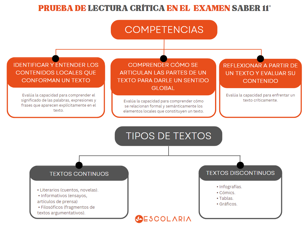 Las preguntas de la prueba de Lectura Crítica en las pruebas Saber 11° evalúan 3 competencias, a través de 2 tipos de textos.